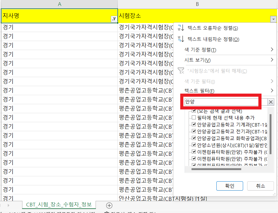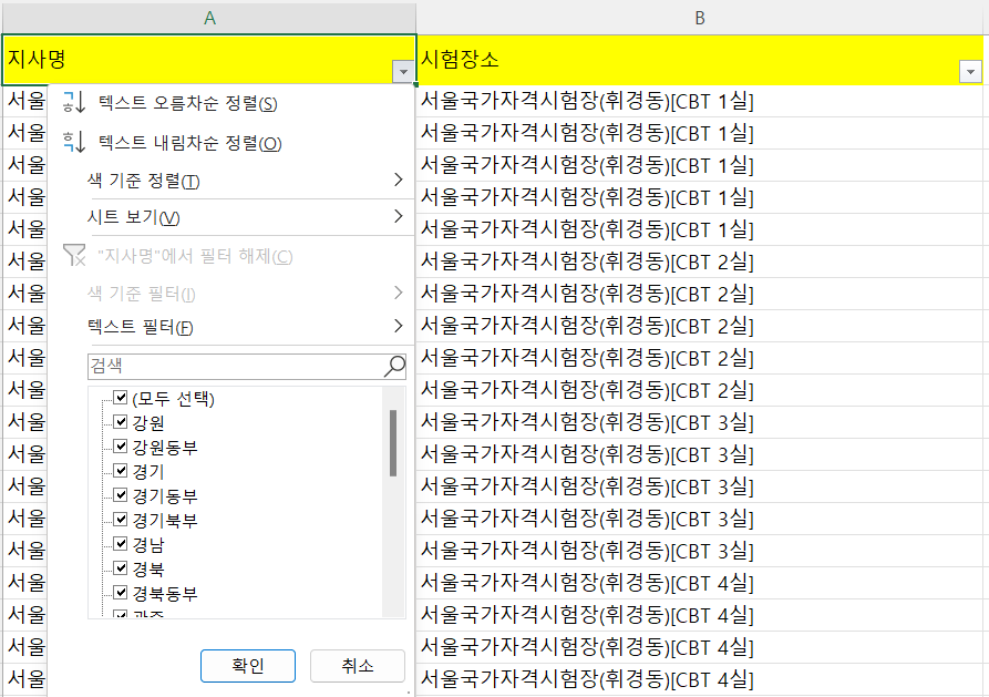 시험장소에도 1실, 2실등 중복이 많으니 시험장소도 필터링 후 검색에서 단어로 검색하시면 됩니다.